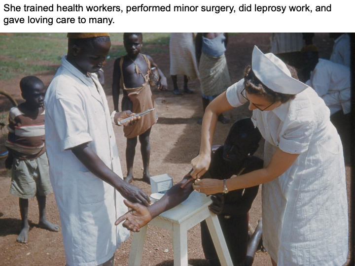 The majority of the population was Muslim and there were very few visible results of people coming to faith. The heat, loneliness, lack of fresh food, difficult medical cases without a doctor’s advice and the propensity of bugs made life difficult and at times discouraging. The work was demanding. In addition, Ruth also dealt with patients in the segregated leprosy village. For Ruth, facing these many medical challenges and the decisions that needed to go with them was greatly demanding. George spent much of his time trekking in the villages to distribute medicines and seeking opportunities to talk to Muslim village elders about the gospel. However, George & Ruth’s awareness of their mutual calling to missions, their steady and tenacious personalities and their love for the Nigerian people enabled them, with God’s help, to meet the daily challenges
