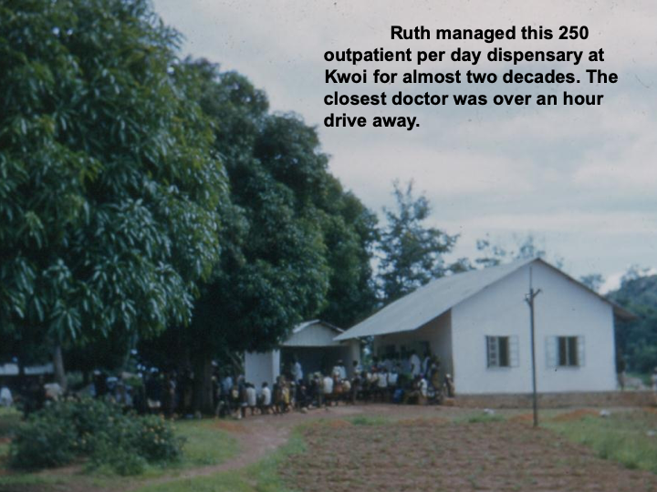 In December 1956 the mission moved Ruth and George south to a small agricultural town of Kwoi. Ruth was again assigned to head a medical clinic and George taught at the Hausa Bible School. They were welcomed by a small community of missionaries and a large population of Christians in Kwoi.